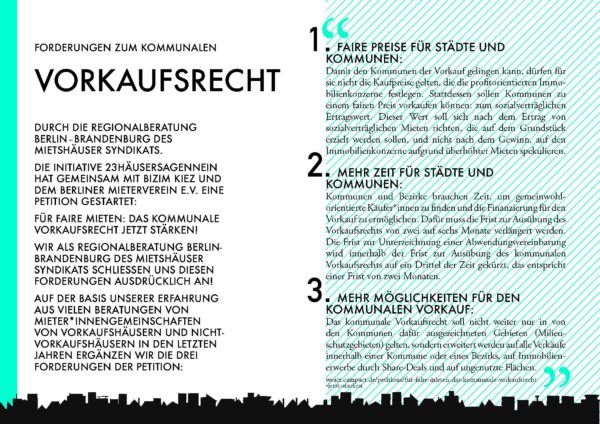 Die Regionalberatung des Mietshäuser Syndikats in Berlin-Brandenburg (MHS BB) hat auf der Basis langjähriger Erfahrungen in der Beratung von Mieter:innengemeinschaften in der Bedrängnis von kapitalstarken Investoren sieben Forderungen für eine Stärkung des kommunalen Vorkaufsrecht ausgearbeitet. Wir finden diese Forderungen unterstützens- und vebreitenswert. Die entstehende Stadtbodenstiftung und das Mietshäuser Syndikat stehen sich ideel sehr nahe. Beiden wollen der Spekulation mit Immobilien dauerhafte Schranken setzen. Möglicherweise werden wir in Zukunft auch in dieser Absicht in gemeinsamen Projekten kooperieren. Hier können die Forderungen gelesen werden: