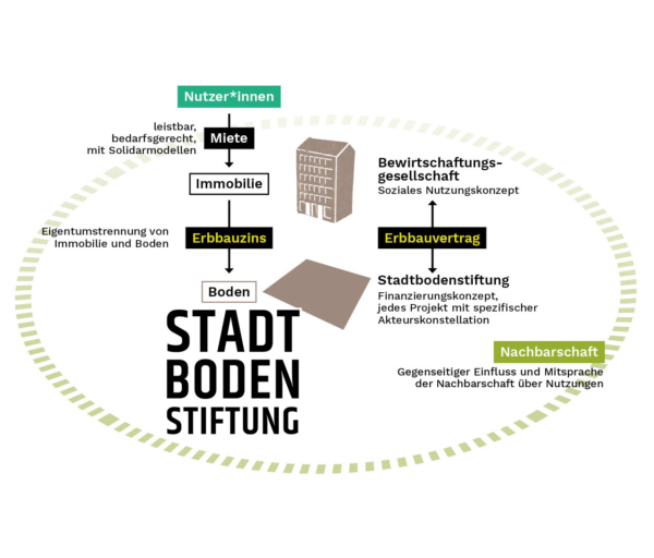 Berlin braucht einen starken gemeinnützigen und kollektiven Gegenpol zur Spekulation mit dem Boden der Stadt. Die Idee: Eine demokratisch organisierte Stadtbodenstiftung soll, inspiriert vom Modell des „Community Land Trust“ (CLT), einen anderen Umgang mit Eigentum beispielhaft umsetzen und der von Kapitalinteressen forcierten Spekulation Grund und Boden dauerhaft entziehen. Eine zivilgesellschaftliche Initiative verfolgt, zunächst mit Unterstützung des Bezirkamts Friedrichshain-Kreuzberg, mittlerweile auch mit einer Projektförderung des Landes Berlin, seit zwei Jahren konsequent diesen Plan. Mit der Etablierung einer Bürgerstiftung soll ein neuer Akteur gemeinwohlorientierter Stadtentwicklung institutionalisiert werden. Die Stiftung wird gemeinsam mit unterschiedlichsten Partnern, von Genossenschaften über Nachbarschaftsinitiativen bis hin zu ethischen Banken, bestehende Immobilien sichern und neue Projekte umsetzen. Sobald die gemeinnützige Bodenstiftung de jure realisiert ist, gilt ihr Angebot für den gesamten Stadtraum und das Berliner Umland. Ein „Mit-Mach-Angebot“ an die Stadtgesellschaft. Projekte initiieren, Nachbarschaften stärken, durch eine breite Mobilisierung von Ressourcen wahrnehmbare Zeichen einer solidarischen Stadtentwicklung setzen.